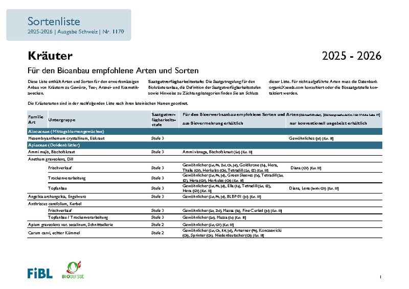 Überdies hat das FiBL Schweiz in Zusammenarbeit mit weiteren Fachleuten die "Sortenliste Kräuter" aktualisiert. Sie enthält Arten und Sorten für den erwerbsmässigen Anbau von Kräutern zu Gewürz-, Tee-, Arznei- und Kosmetikzwecken in der Schweiz. Da das Saatgutangebot bei einigen der empfohlenen Sorten knapp ist, empfiehlt es sich, möglichst bald die Saatgutbestellung in Angriff zu nehmen.