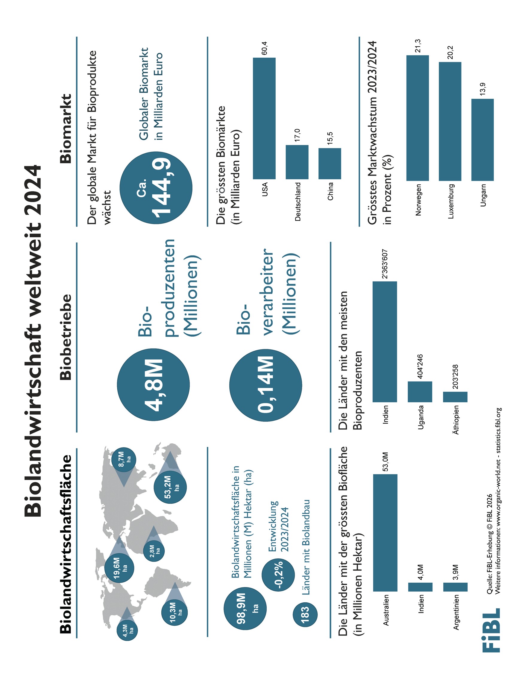 The World of Organic Agriculture 2026: Statistics and Emerging Trends ist das führende globale Referenzwerk für Daten zum Biosektor (Fläche, Betriebe, Märkte und internationaler Handel). Die Daten werden vom FiBL in Zusammenarbeit mit IFOAM – Organics International sowie nationalen Datenpartnern zusammengestellt.