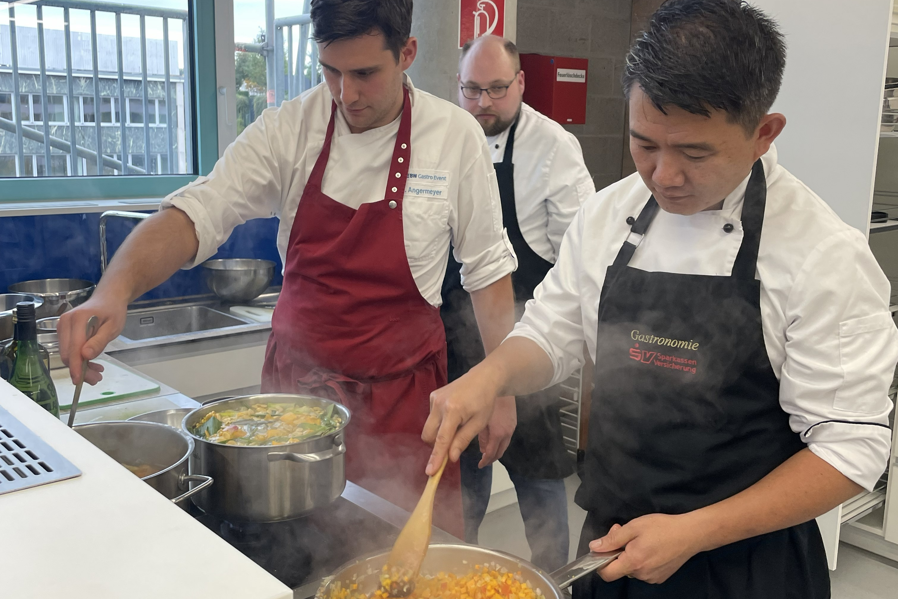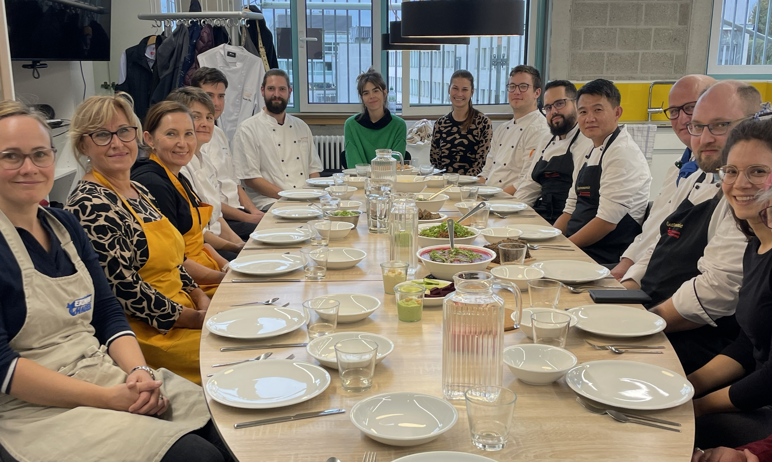 Zwölf Köch*innen und Köche aus Betriebsrestaurants, von Mercedes Benz über die Sparkassenversicherung bis zu Mitarbeitenden der Landeskantinen machten sich in Gruppen von zwei bis drei Personen daran, die vom Spitzenkoch vorgeschlagenen Rezepte zuzubereiten. "Häufig kann ich aus einer Hauptzutat mehrere geschmacklich variierende Varianten kochen", erklärt Hinze und ergänzt: "Beispielweise wird aus der Grundzutat Alblinsen ein Braten, Bratlinge und eine Linsenbolognese. Aus den vorgekochten Kichererbsen entstehen dreierlei Hummus, klassisch, mit Kräutern und Rote Bete sowie eine köstliche Schokocreme als Dessert."