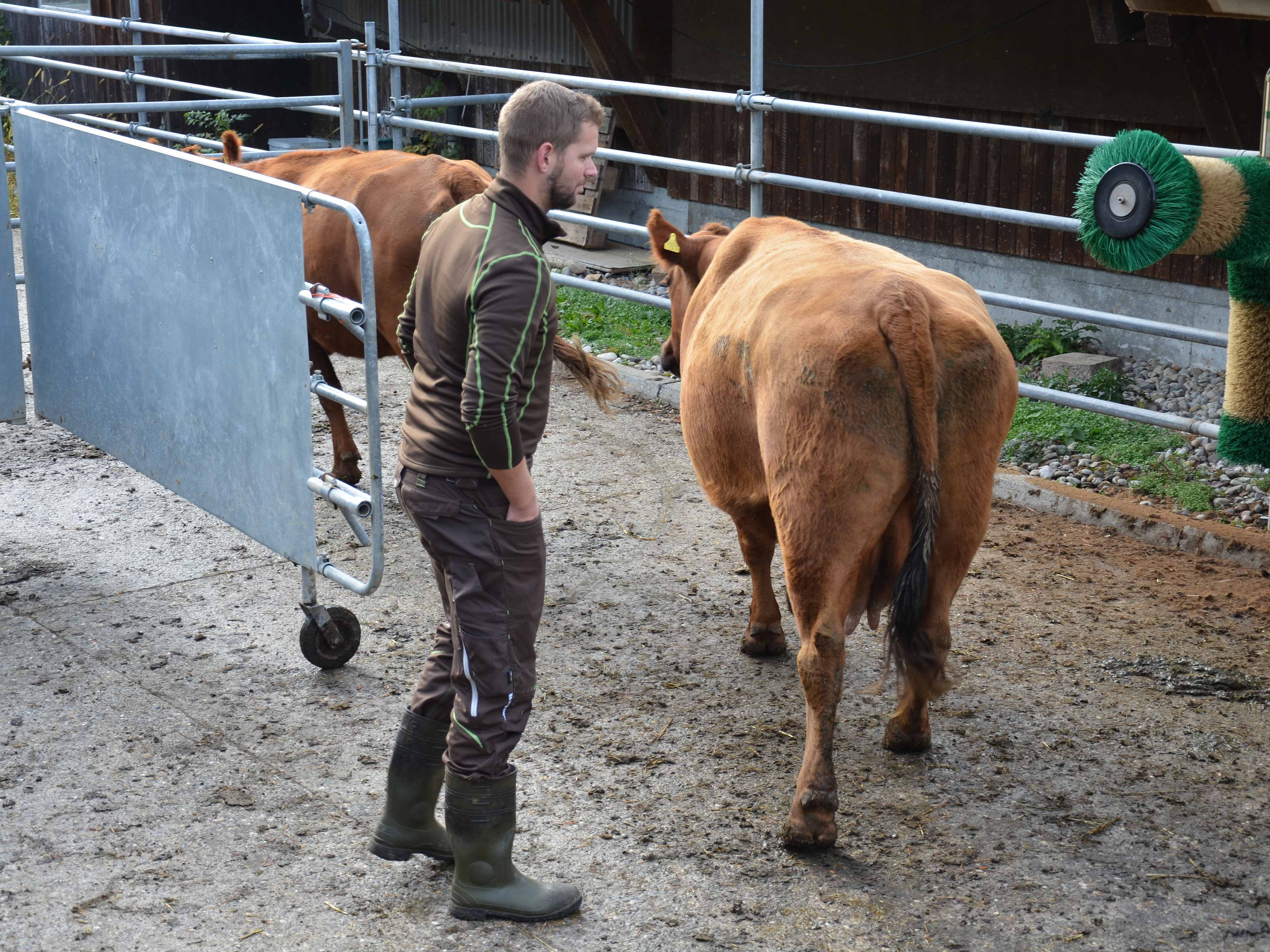 Damian Laube ist einer der Projektteilnehmenden. Auf seinem Betrieb mit 25 Mutterkühen und zehn Weiderindern wandte er das neue Wissen aus dem Kurs erfolgreich an. Er erzählt: "Zu Beginn war die Arbeit mit Low Stress Stockmanship eine Umstellung. Das Treiben lief beim ersten Mal nicht besonders gut, da kam schon Skepsis auf bei mir. Beim zweiten Mal war ich jedoch überrascht: Da lagen Welten dazwischen."