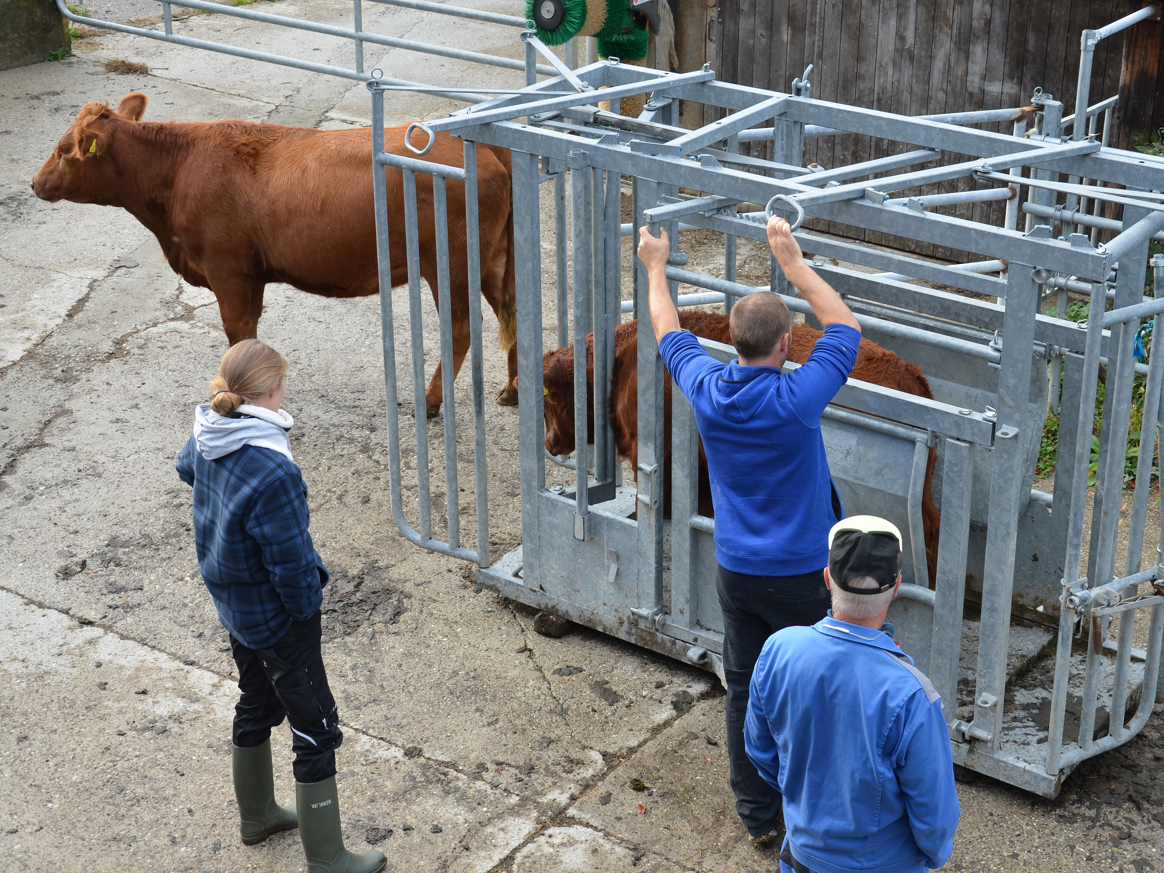 Stockmanship lehrt den Zusammenhang zwischen der Aktion des Menschen und der Reaktion der Tiere. Dadurch wird ein ruhiger und effizienter Umgang möglich. Die Projektteilnehmenden trainierten mit ihren Kälbern je dreimal das Treiben durch einen sechs Meter langen Panelgang und die Fixierung in einem Behandlungs- oder Wiegestand. Der Aufwand betrug durchschnittlich zehn Minuten pro Tier, dazu kam je nach Gegebenheiten das Einrichten des Treibgangs.