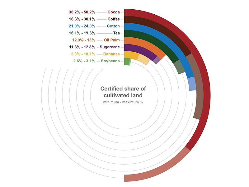 Die freiwilligen Standards sind in der Regel Normen und Anforderungen in Bezug auf Umwelt-, Sozial-, Ethik- und Lebensmittelsicherheitsfragen, die unabhängig geprüft werden. Der Bericht analysiert 13 wichtige Nachhaltigkeitsstandards für acht landwirtschaftliche Rohstoffe (Baumwolle, Kakao, Palmöl, Soja, Zuckerrohr, Bananen, Kaffee und Tee) und für Wald. 2023 waren mindestens 9,7 Prozent der weltweiten Anbaufläche dieser landwirtschaftlichen Rohstoffe zertifiziert, und auch beim Wald lag die zertifizierte Fläche weltweit bei mindestens 9,7 Prozent.
